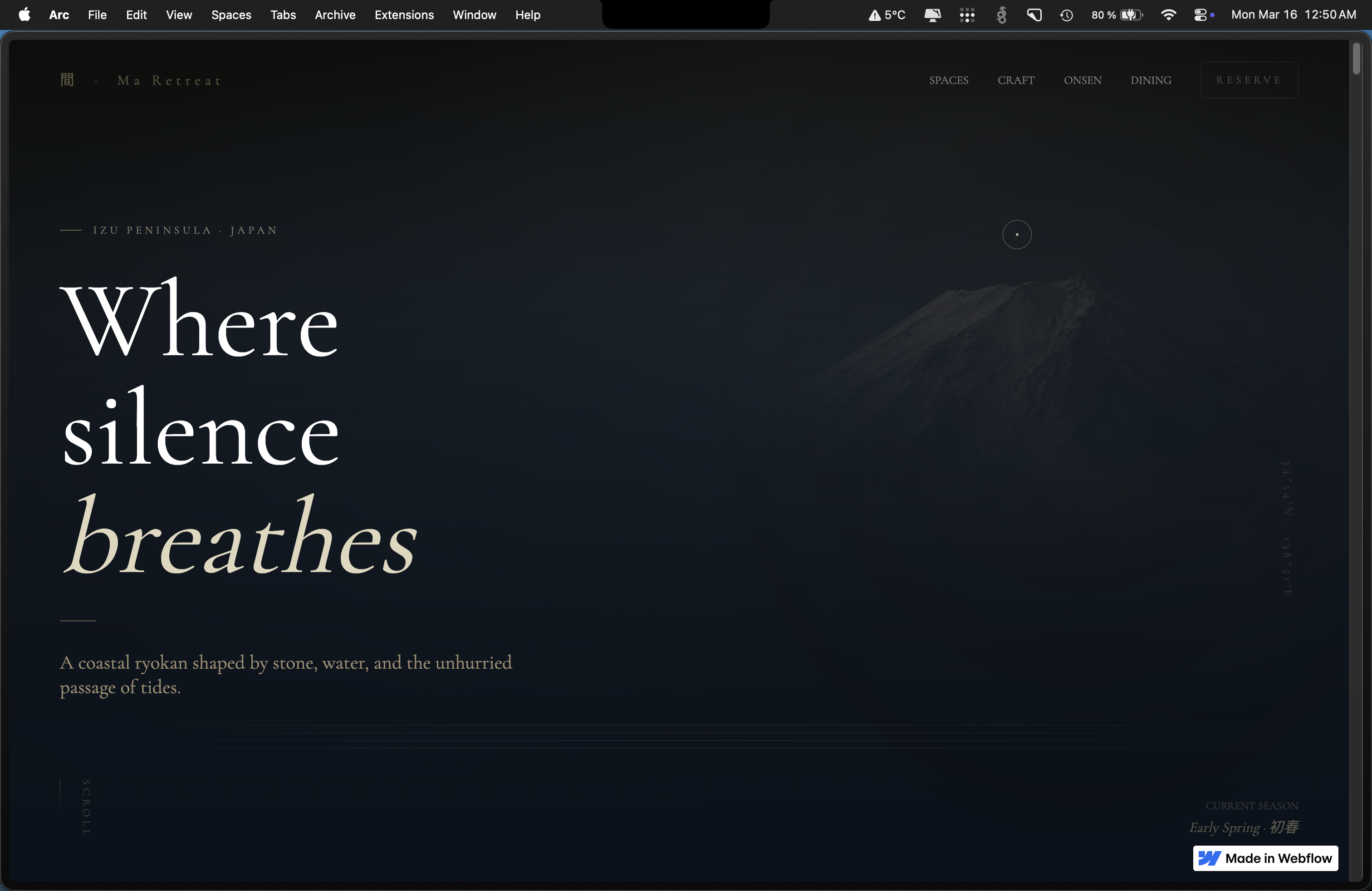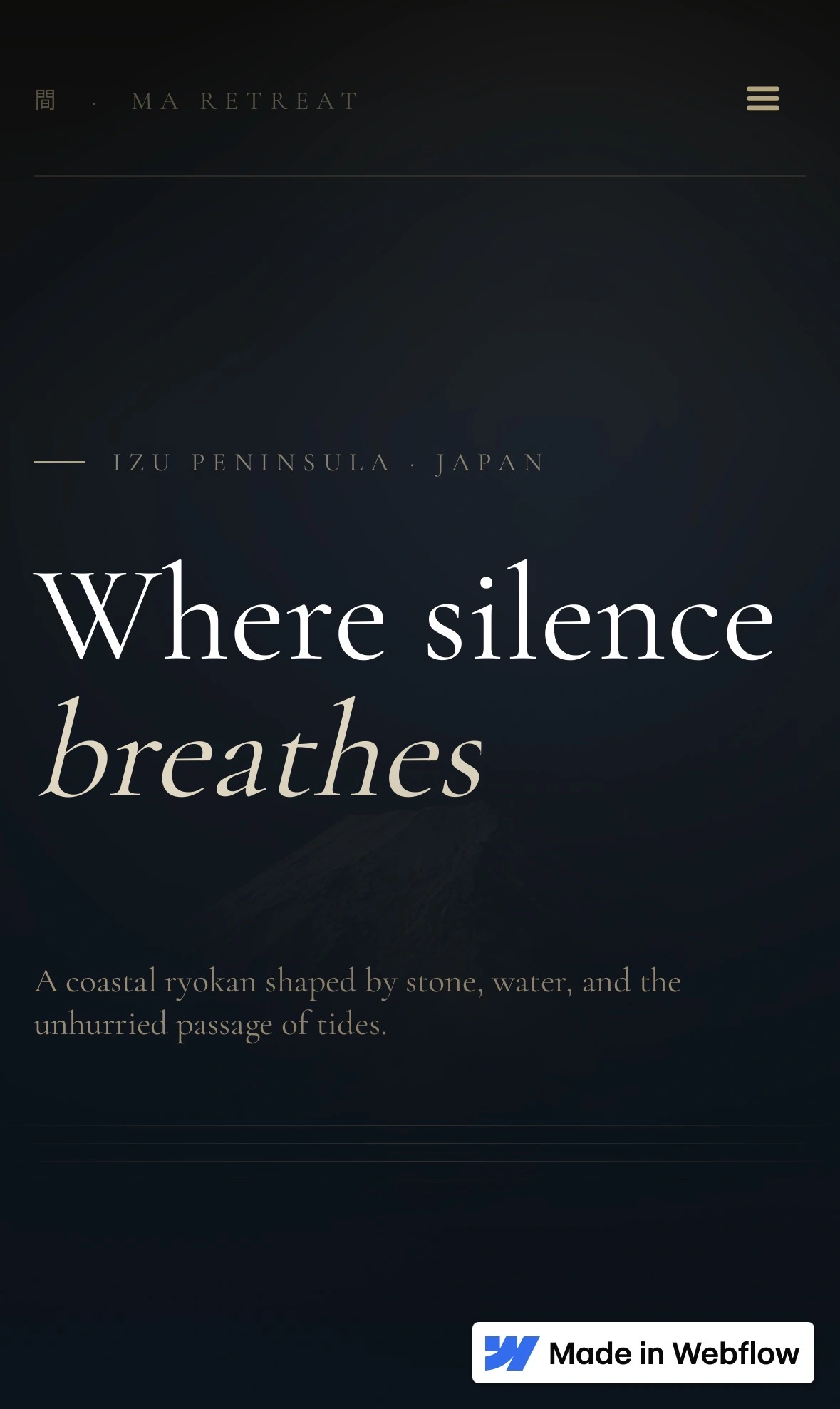 This project involves creating Ma Retreat, an immersive digital experience for a private Japanese onsen retreat. The website features scroll-driven parallax galleries, interactive bathing space filters, and a custom reservation system with dynamic guest-based availability, ensuring a contemplative and visually rich browsing experience. The project focused on blending atmospheric dark UI design with complex GSAP animations, redefining how guests discover and reserve traditional Japanese bathing rituals. Using Webflow, the platform was built to bridge the gap between centuries-old wellness traditions and modern web craftsmanship.